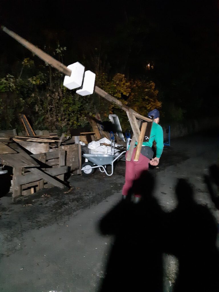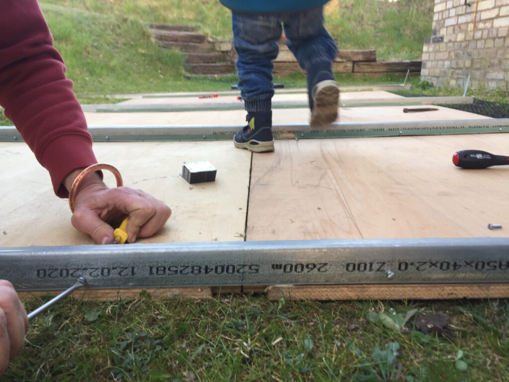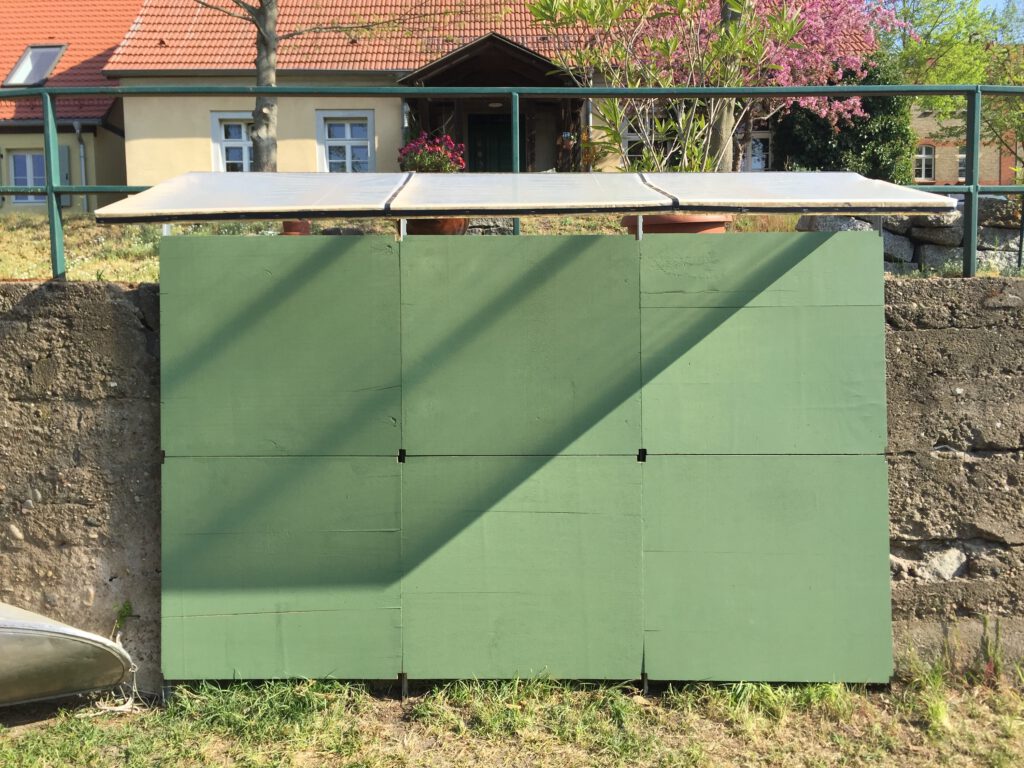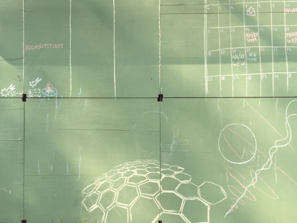 In meinem Fall mit der Familie habe ich zunächst eine Praktische, der Situation entsprechend hilfreiche und realistische Installation entwickelt, um für für alle eine bessere Kommunikation zu ermöglichen. Dafür habe ich aus Materialien, die vor Ort schon vorhanden waren, und mit einigen Anschaffungen aus dem Baumarkt eine 1,90X2,10 meter große Tafel mit Überdachung gebaut. Sie ist an einem gut zu sehenden und präsenten Ort auf unserem Hof positioniert und ich hoffe, dass alle Familienmitglieder etwas für unsere gemeinsame Übersicht beitragen werden. Eine Standart Wochen- und Monatsstruktur habe ich schonmal vorgegeben, aber es ist auch Platz für jegliche Skizzen oder Notizen.